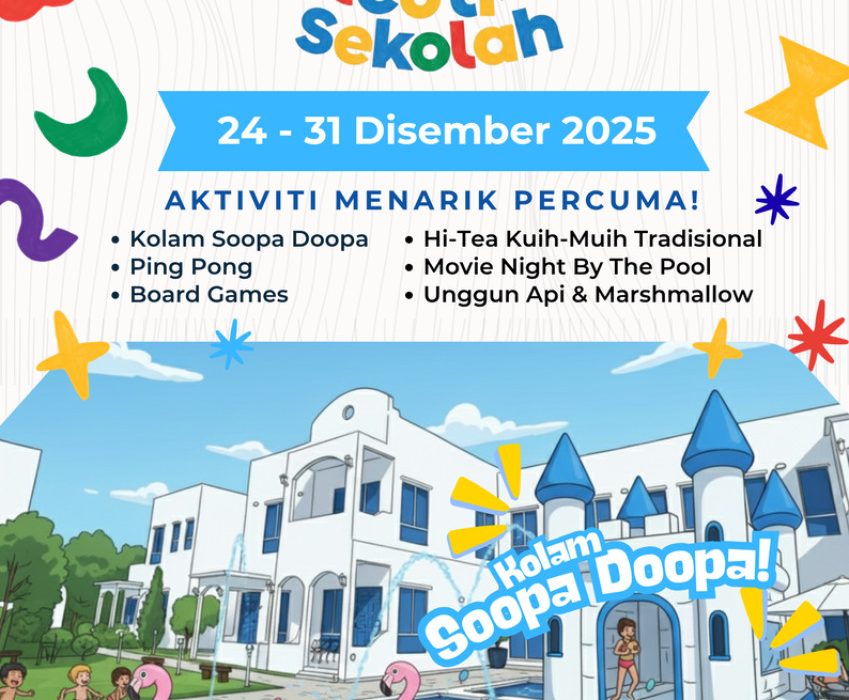 About this Deal Musim cuti sekolah akhir tahun dah tiba! Jom rancang percutian yang penuh keseronokan dan kenangan indah bersama keluarga tersayang di The Arjana Resort! 🌴 Dari 24 hingga 31 Disember 2025, kami bawakan pakej ‘Riang Ria Cuti Sekolah’ istimewa dengan pelbagai aktiviti menarik yang pastinya akan membuatkan anak-anak anda teruja dan seisi keluarga anda gembira! 🎁 Aktiviti Percuma Eksklusif untuk Tetamu:Apabila