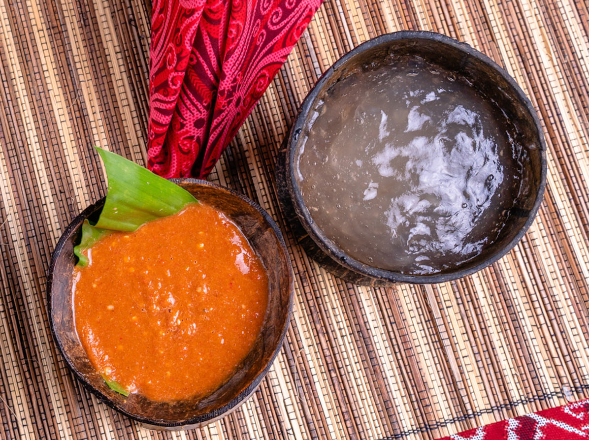 The dish is made from sago, a starch extracted from the sago palm. Mixed with water and gently cooked, the sago transforms into a thick, sticky paste with a distinctive gelatinous and chewy texture. Mild in flavour, Sago Linut is intentionally neutral, making it the perfect base for accompanying dishes.