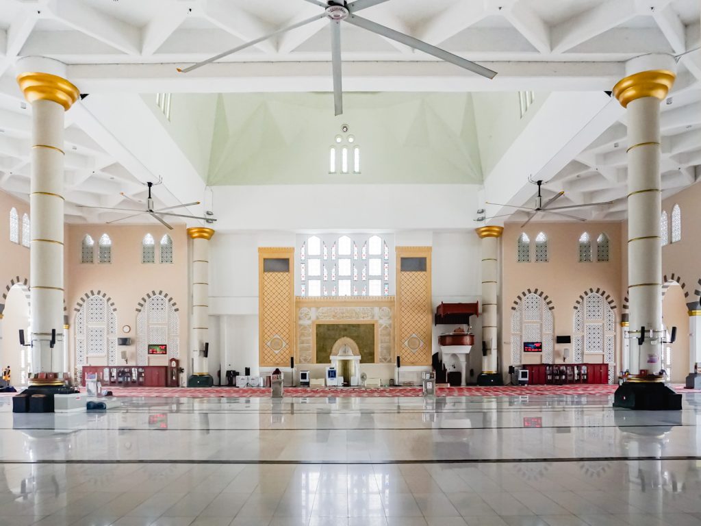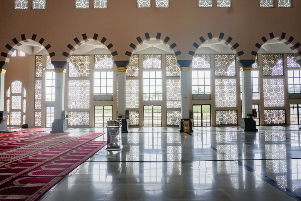 As the largest floating mosque in Kota Kinabalu and among the most picturesque in Malaysia, it can accommodate between 9,000 to 12,000 worshippers. Visitors are welcome, provided they register in advance through the Kota Kinabalu City Mosque Tourism Management. Out of respect for the sacred setting, modest attire is required — robes can be rented at the entrance. Visitors are also reminded to refrain from eating, drinking, or imitating religious practices within the mosque grounds