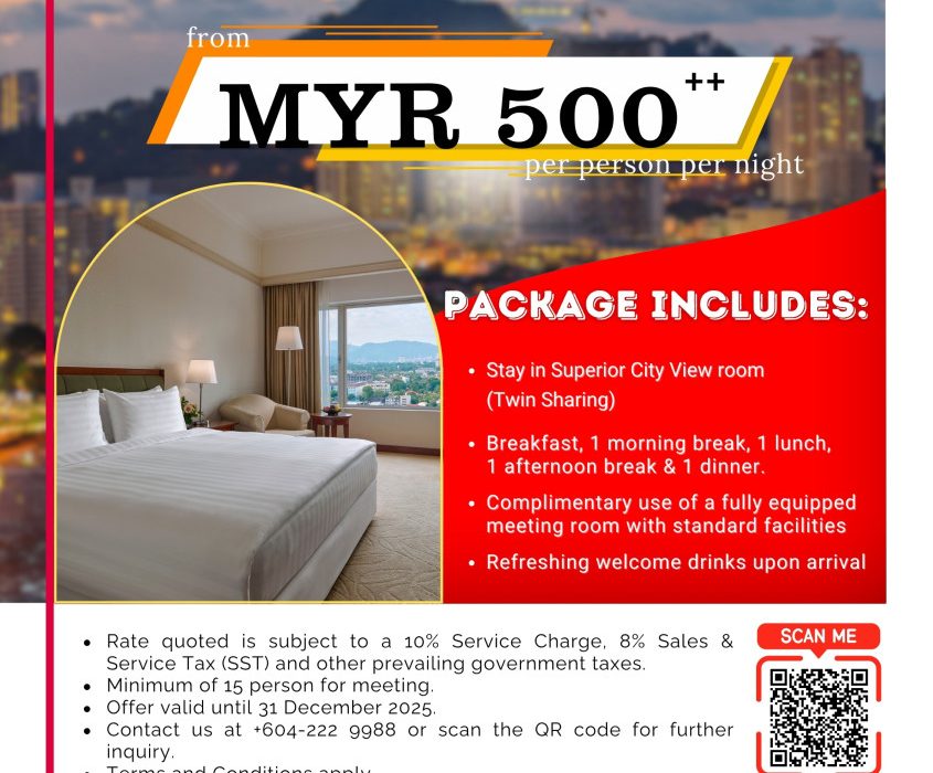 About this Deal Stay in Superior City View room (Twin Sharing) Breakfast, 1 morning break, 1 lunch, 1 afternoon break & 1 dinner Complimentary use of a fully equipped meeting room with standard facilities Refreshing welcome drinks upon arrival Rate Information Rate quoted is subject to a 10% Service Charge, 8% Sales & Service Tax